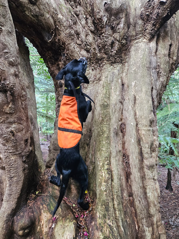 Figure 2: Qualmons Possum dog Beck (handler – Kiri Stack), in action, indicating on a possum up a pūriri tree. A trap is then set based on the positive detection